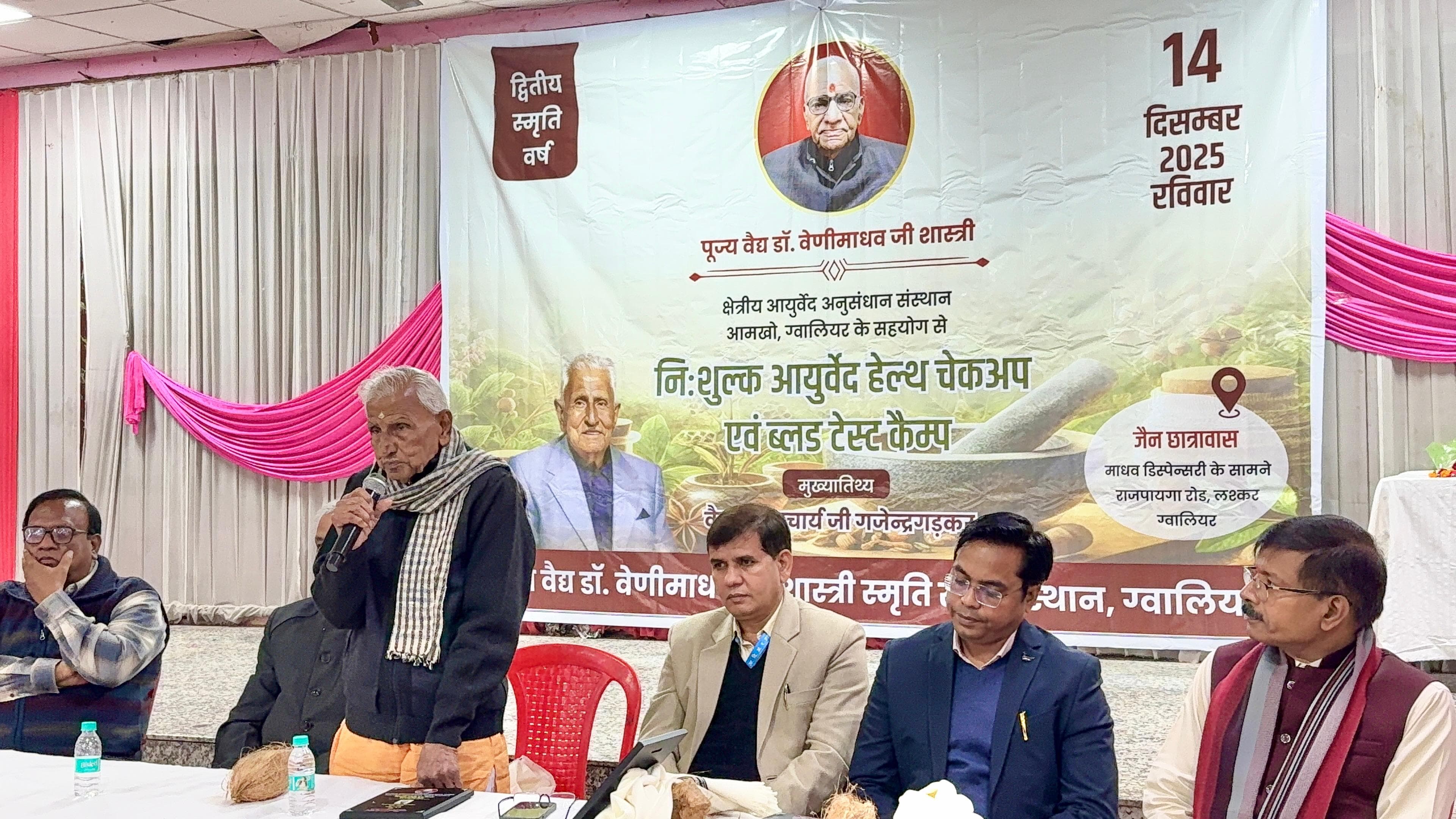 ग्वालियर राजवैध वैधाचार्य डॉ वेणी माधव शास्त्री जी की द्वितीय पुण्यतिथि के अवसर पर आज एक आयुर्वेदिक स्वास्थ्य जांच शिविर का आयोजन जैन छात्रावास में डॉक्टर बेनी माधव शास्त्री स्मृति सेवा संस्थान द्वारा किया गया था जो क्षेत्रीय आयुर्वेद अनुसंधान ग्वालियर के सहयोग से संपन्न हुआ इस अवसर पर मुख्य अतिथि के रूप में बोलते हुए