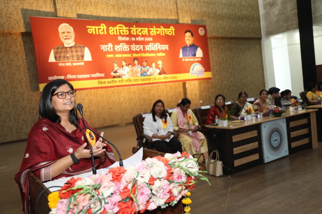 मौका था जिला प्रशासन द्वारा जीवाजी विश्वविद्यालय के अटल सभागार में आयोजित की गई नारी शक्ति वंदन संगोष्ठी का। इस अवसर पर सभी ने ऐतिहासिक “नारी शक्ति वंदन अधिनियम” की खुशियां सांझा की। साथ ही महिला सशक्तिकरण की दिशा में इस क्रांतिकारी कदम के लिए प्रधानमंत्री नरेन्द्र मोदी के प्रति कृतज्ञता भी व्यक्त की। ग्वालियर की धरा नारी शक्ति वंदन अधिनियम आने की खुशी से सराबोर दिखी। अटल सभागार का भव्य मंच जिला पंचायत की अध्यक्ष श्रीमती दुर्गेश कुंवर सिंह जाटव, राजा मानसिंह तोमर संगीत एवं कला विश्वविद्यालय की कुलगुरु प्रोफेसर स्मिता सहस्त्रबुद्धे, एलएनआइपी की कुलगुरु डॉ कल्पना शर्मा, कलेक्टर श्रीमती रुचिका चौहान, राज्य महिला आयोग की पूर्व अध्यक्ष श्रीमती कृष्णकांता तोमर, सुप्रसिद्ध समाजसेविका सुश्री मीनाक्षी पिशवे, पूर्व महापौर श्रीमती समीक्षा गुप्ता, अतिरिक्त पुलिस अधीक्षक श्रीमती विदिता डागर, समाजसेवी श्रीमती नीलिमा शिंदे, अधिवक्ता श्रीमती चित्रा बैस, डीआरडीई की वैज्ञानिक डॉ मनीषा सेठी, चिकित्सक डॉ बिंदु सिंघल, महिला हॉकी कॉच श्रीमती वंदना उइके, सीएसपी श्रीमती हिना खान व समाजसेवी श्रीमती अंजली गुप्ता बत्रा से सुशोभित था। वहीं विशाल अटल सभागार नारी शक्ति से खचा-खच भरा था।